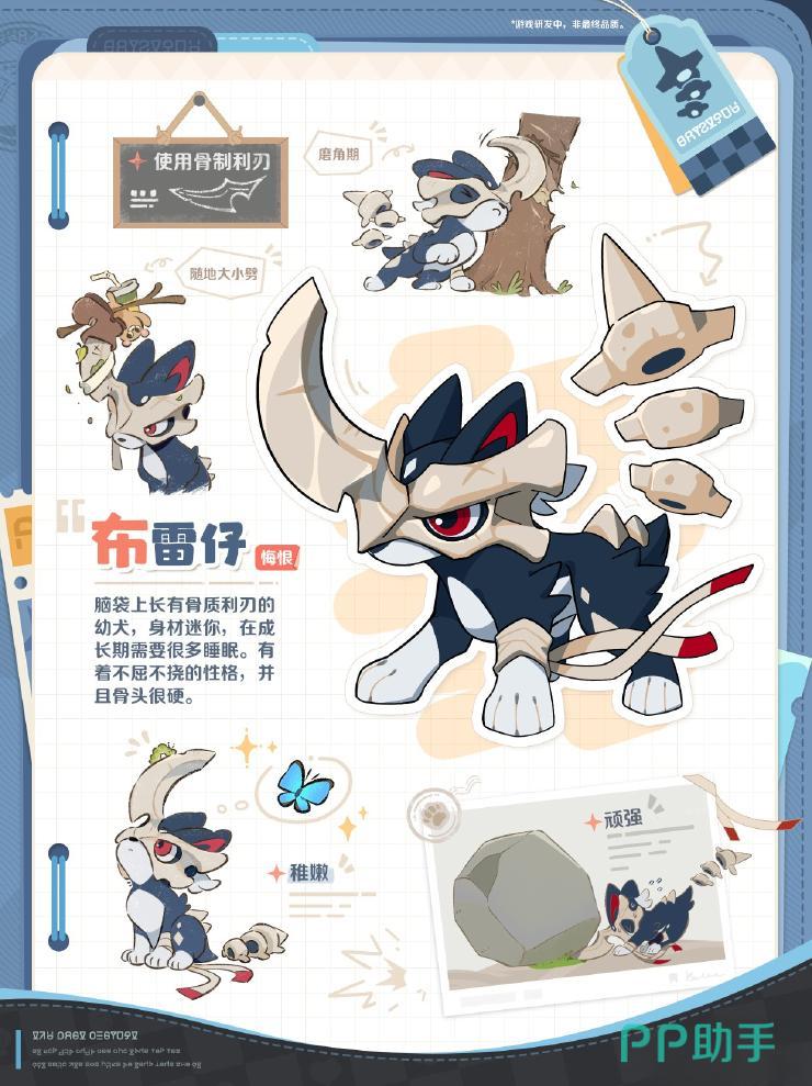 布雷仔是一种外形类似幼犬的精灵,头部生长着坚硬如骨质的利剑,常借助路灯或墙壁打磨其头角以保持锋利。尽管体型娇小,但骨骼结实,性格坚韧不屈。它以骨刺为主要攻击手段,战斗风格顽强且富有侵略性。其核心机制源于“悔恨”,特性为“小脾气”。身高设定为99厘米,最大能量值可达52点能焦。