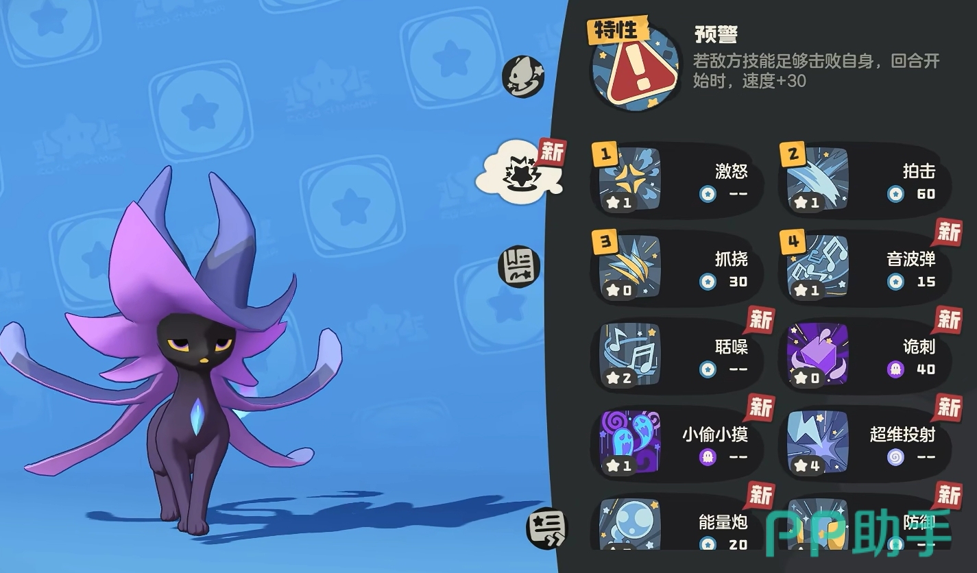 与黑猫密探一样,黑猫巫师同样是普通系的精灵,且它的速度属性有着不错的成长值,本身的魔攻也不差,所以很多时候都会被培养成速攻魔宠来使用。同时,黑猫巫师还具有一个很独特的预警机制,只要敌方在回合内要释放的技能会击败它,那黑猫巫师会在本回合内得到加三十速的增益,可比对手先一步打出要释放的攻击,避免本回合的进攻指令不会落空,在对方精灵丝血时,甚至能通过这个特性来直接将对手反杀掉。特别是在与一些对黑猫巫师特性不够了解的玩家对战时,只要时机合适,黑猫巫师就能凭借这一手让对方吃大亏。