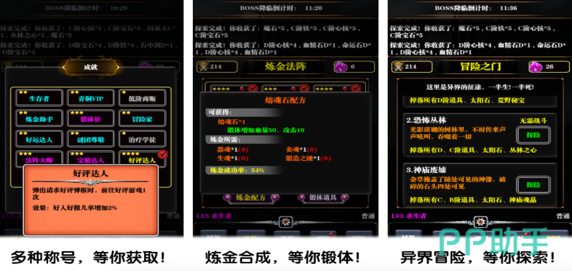 这是一款以文字叙述为核心的竖屏挂机类暗黑游戏,虽界面简洁但内容充实。玩家可在庞大的文字地图中探索异世界,完成成就任务获得专属称号。炼金与武器合成系统延长了游戏生命周期,爬塔玩法层层递进,带来持续成长的满足感。文字交互形式增强了代入感,适合碎片化时间游玩。