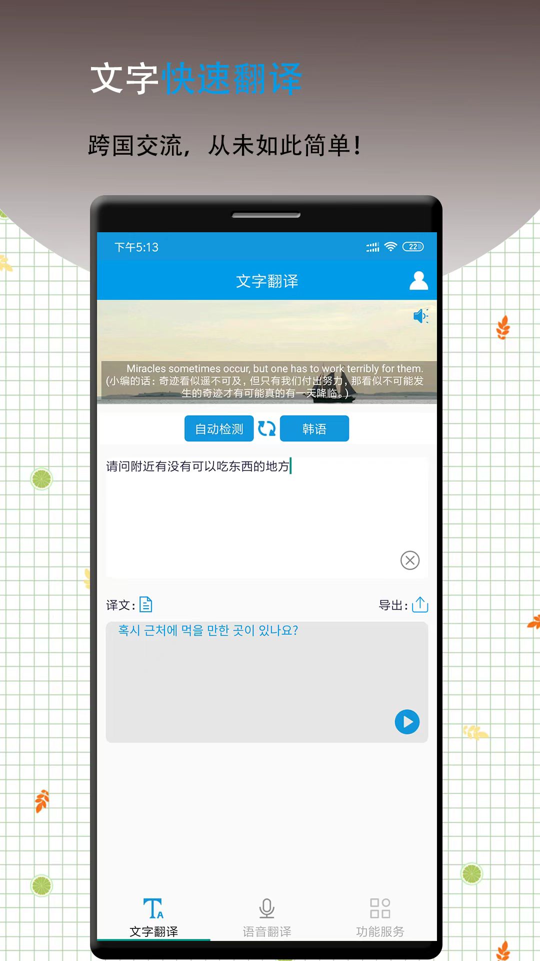 该软件支持多种语言之间的互译,涵盖文本输入、语音识别以及图片扫描翻译等多种模式。只需通过拍照即可快速提取画面中的文字内容,并选择目标语言进行即时翻译,操作便捷,响应迅速。