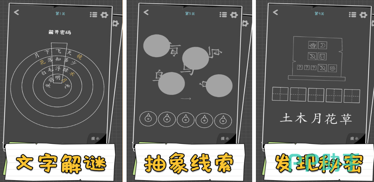 猜字达人这款文字解谜类手游带来的辨识度更高,因为整体画面超级简单也显示出简体汉字风格,寻找汉字、汉字解谜等超多解谜性质耐玩性更高,几乎所有的汉字解谜关卡呈现的难度都比较高,好在有着良心的提示方式能找到解谜关键,白底黑字画面呈现犹如面对一张洁白的试卷,很沉浸的孩子主题解谜性质也极为有趣。