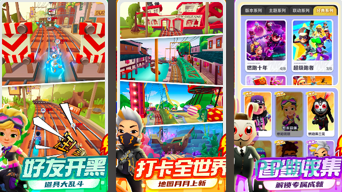 《地铁跑酷》在线已有10余年之久,全球的下载量已经成功突破40亿,六大基本角色,以及各种节日特定角色,让这款小游戏处处充满惊喜。简约有趣的滑动操作模式,让手残党玩家也可高能体验。金币、钥匙等数十种道具,在跑道中通通可以收集。地图场景进行了多样化丰富,加入了北京、澳门等数十处中国城市的地标场景。