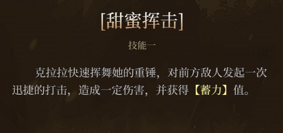 克拉拉的技能一叫做甜蜜回击,使用这个技能的时候,同样会利用到她手中的锤子,对敌人发起一次速度很快的输出,造成伤害之后一样会有蓄力值提升的效果,当然相比技能一的话,她的技能二效果更丰富一些,使用技能二,克拉拉会一边移动一边使用手中的大锤,然后旋转向前进行移动,这个移动可以看成是一个位移的效果,此时只要是周围的敌人,在她位移前进的路径里面,周围的敌人都会受到一定的伤害,且根据伤害数值会恢复一定的蓄力值,如果这个技能命中的话,那么技能还可以带来一次派生的效果,后期派生会变成蜜蜡锤、野蜂轮舞的效果。