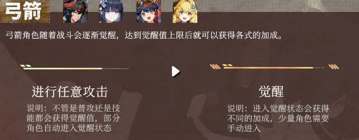 弓箭:弓箭类的角色随着战斗时间逐渐触发觉醒的效果,不过这也需要达到相应的觉醒数值才可以,大家用过攻击来积累此类数值,一旦达到觉醒值上限相应的觉醒值,部分角色自动进入觉醒状态,进入觉醒状态会获得不同效果上面的加成,其中的少量角色需要手动进入这个状态,一般都是在觉醒数值达到上限之后自动触发这个觉醒状态的,而且相对于其他类型的武器机制来说,这里觉醒效果带来的加成更具有针对性,输出效果比较好的角色觉醒后输出更强,防御效果更好的角色在觉醒之后防御机制更好用,大家可以凭借这一点有针对性的增强其中角色的效果。