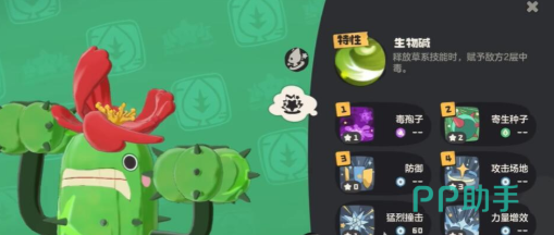 因为它还有一个生物碱的特性,在释放草系技能时就可以给对方挂上两层中毒,这就是迅速叠毒的一个关键。技能搭配方面也可以选择一个实用性的组合,例如寄生种子,还有毒液渗透,再加上一个落井下毒。寄生种子基本上每个回合都能有效吸附敌人8%的血,续航还是比较出色的。毒液渗透不仅可以给敌人造成基础性的中毒,而且还会有一个伤害。只是爆发能力相对而言还是很弱的,千万不要选择正面应对一些高爆发的敌人。