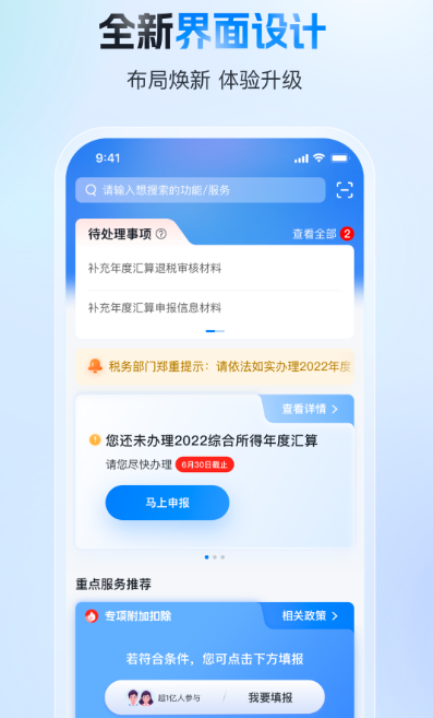 由国家税务总局主导开发的专业个税管理平台,主要用于年度汇算清缴、专项附加扣除填报及相关税务事项处理。首页布局合理,待办提醒醒目,例如“综合所得年度汇算未完成”会及时提示用户进行申报。内置智能引导机制和实时在线咨询功能,帮助用户准确理解政策要求,顺利完成各项个税操作。