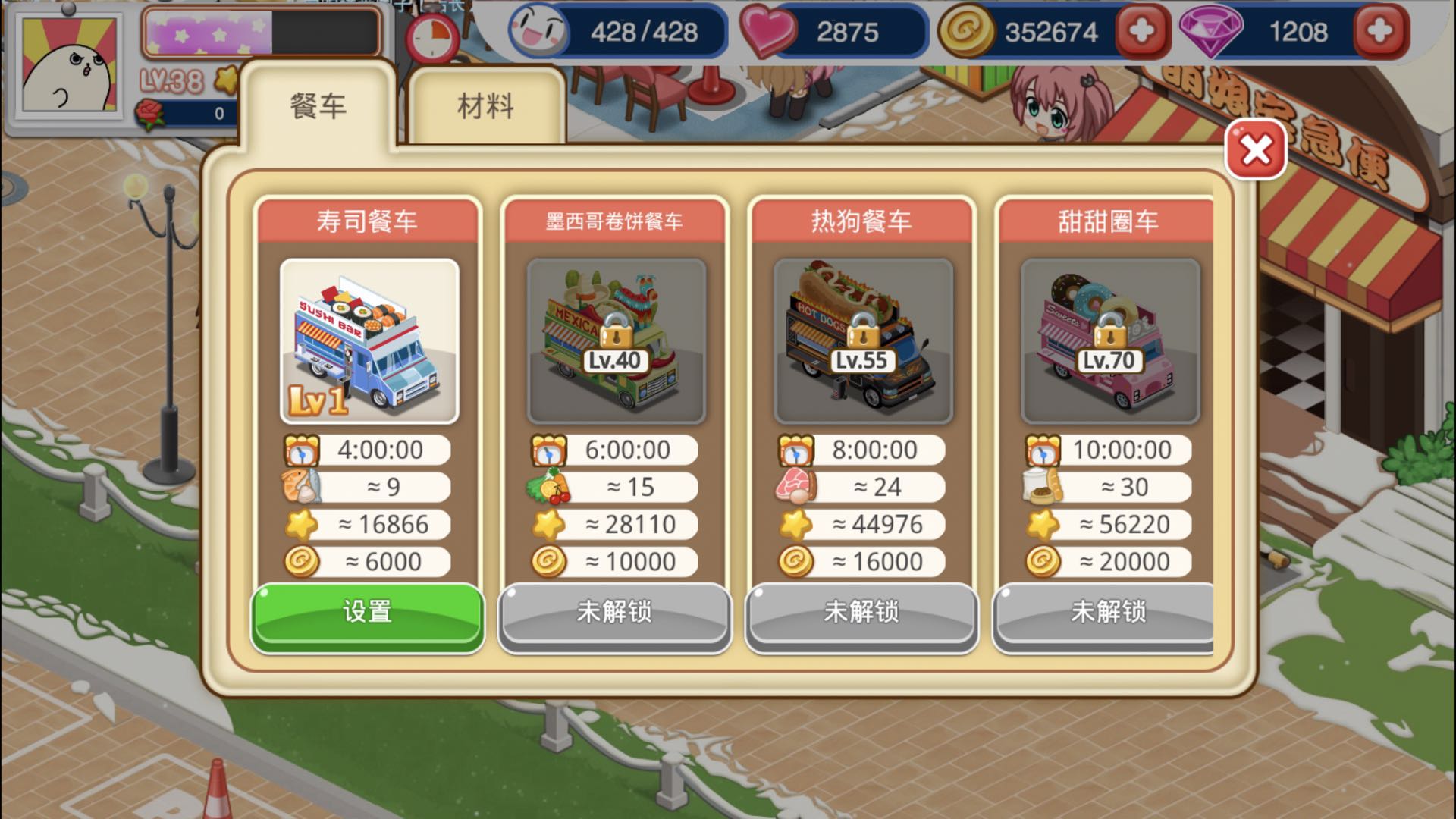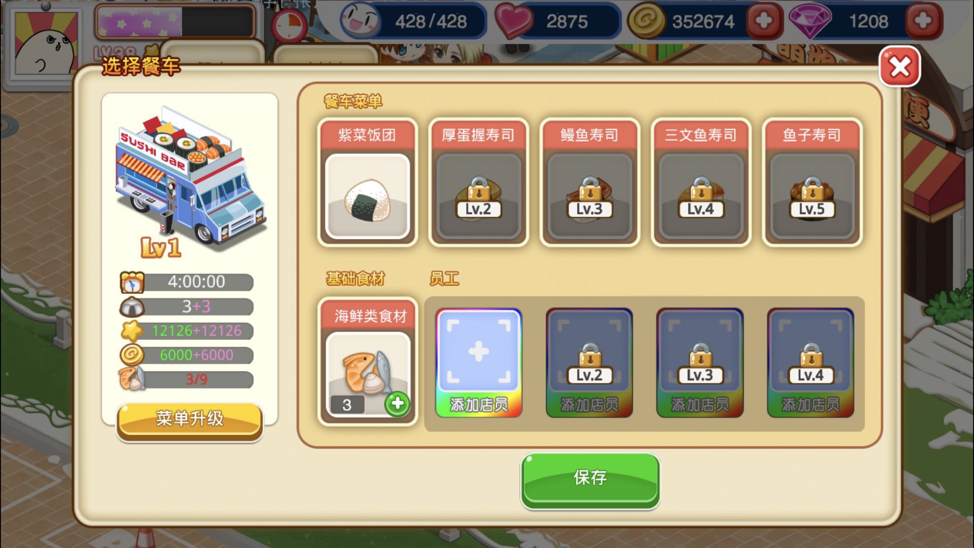 而且每个餐车的菜单也可以进行升级,例如寿司餐车初始菜单是卖紫菜饭团,当餐车达到2级就可以解锁厚蛋握寿司这个菜单了。