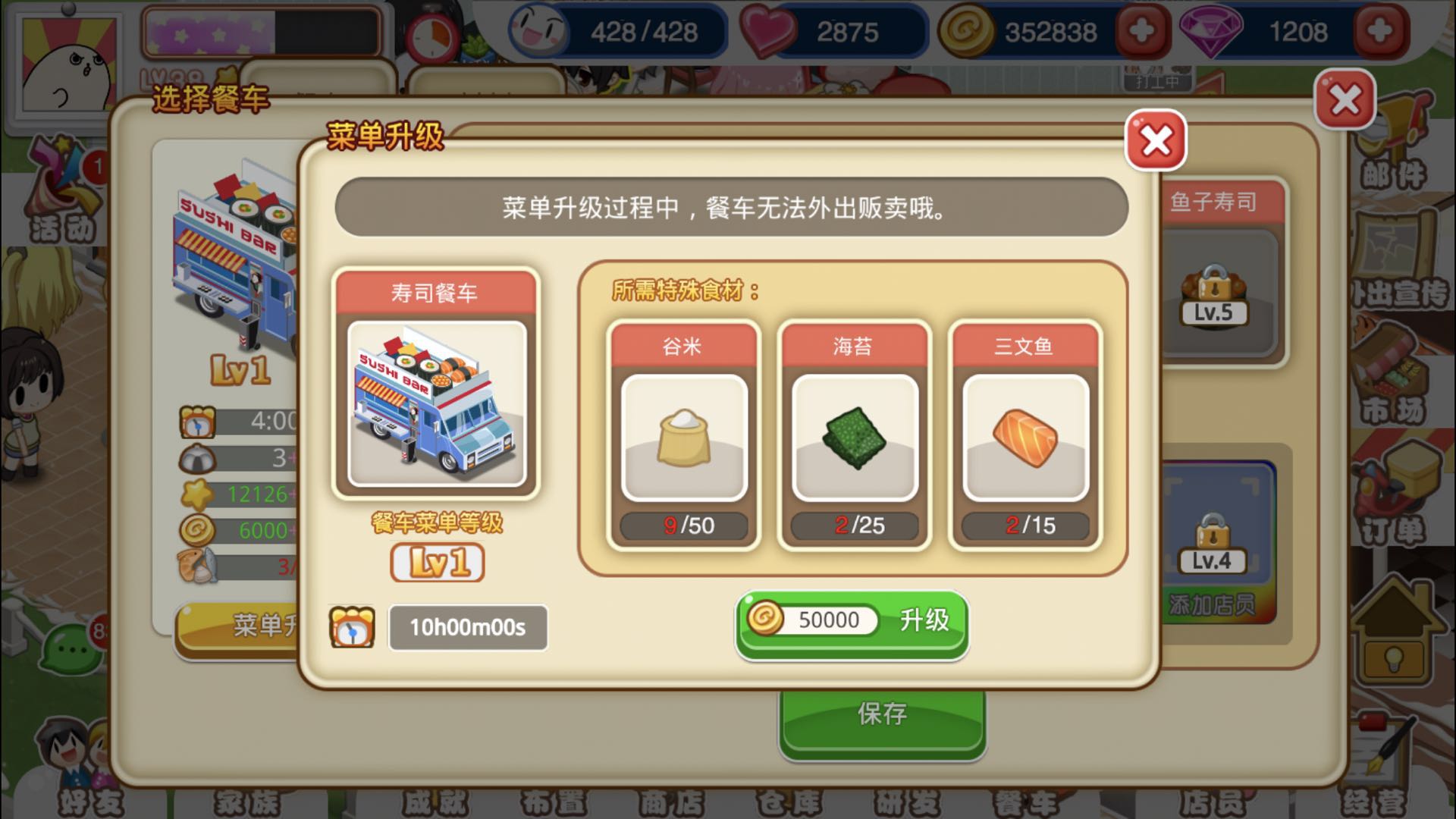 6.当攒够了餐车所需的食材后,就可以点击要升级的餐车界面,选择【菜单升级】,消耗50000金币就能升到菜单2级了。PS:餐车菜单升级的时候,餐车是不能出外贩卖的,因此大家要选择合适的时机进行餐车升级。