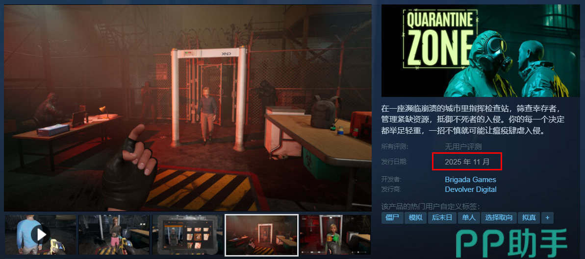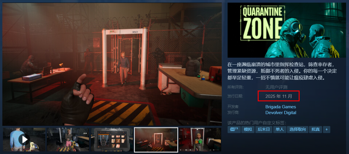 《边境丧尸检察官》在Steam平台上的中文名称,其实是叫做《检疫区:最后一道关卡》,另外您也可以直接搜索其英文名称“Quarantine Zone: The Last Check”,都是可以找到它的。原定发行日是9月,但是开发团队并没准备好,为了再打磨一下品质,于是延期到11月发售了。