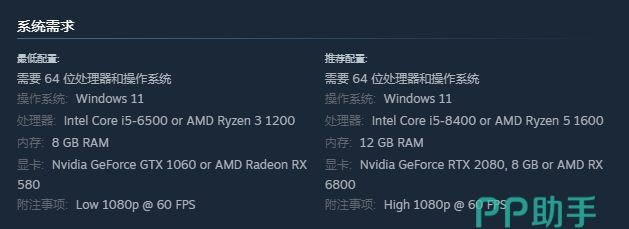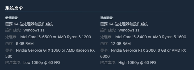官方公布了配置信息,游戏需要在64位windows 11系统上运行,此外,最低需要8 GB内存和1060的显卡,处理器也是至少i5的6500,升级则是推荐i5 8400处理器、12 GB内存以及2080的显卡,以上介绍都是N卡,用相对应的同级A卡替换也可以满足。最低配置可以流畅展现基础动画场景,如果往上升级设备,则能够显示更完整的画质与光线追踪,包括梦境中的恐怖细节。