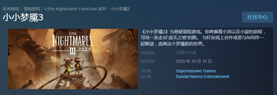 现在的中国市场是庞大的,很多游戏在初始发售版本中就加入了中文版,小小梦魇3也是这样。所以我们在Steam上进行查找时,用中文名就可以搜到,如果用英文名《Little Nightmares III》也可找到相关正确查找页面。