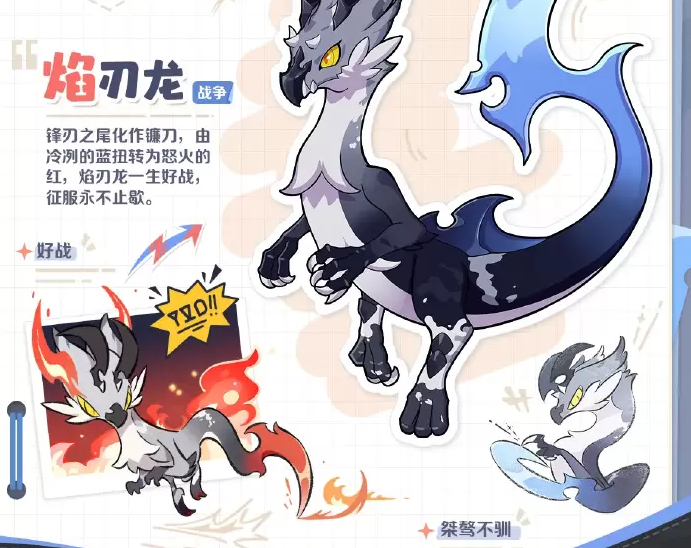 官方所给的标签其实很贴切,一生好战,总喜欢去征服,永远都不会停歇,另外还有桀骜不驯的特点。在看到这一些标签时,那大家就会知道这就是一个妥妥的战斗狂人设。就算在于游戏中遇到很强的对手,都不可能会有退缩,反而会觉得更加的开心。那种永远不服输的劲,是不是早就已经溢出屏幕了?当然在游戏中还会有对应的精灵日记,短短的两句诗也会直接把他一直沉浸在永世的杀戮中。把整个霸气的形象全部勾勒出来,不难想象,在游戏的剧情中,他应该就是有一段很过动人的过往。