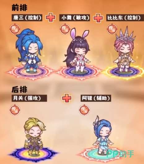 另一套变阵思路是将前排替换成比比东,该角色拥有更强的控制链技能,能显著提升团队的先手优势和压制力。后排维持阿银的辅助定位不变,但可将唐昊替换为月关,以获得更持续稳定的远程输出表现。在此体系下,依然保留阿银的献祭复活机制,确保核心角色在关键时刻能够重返战场,延续战斗节奏。