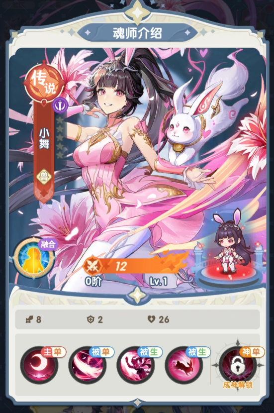 之后就是小舞这个角色也是游戏中的女主角,她整体的设置会更加的偏向敏攻性,灵活是非常高的,那么,在技能方面,主要是呈现一个单体输出的能力,爆发性非常的强,并且打击效果也是很不错的,主要是利用多段的连接来进行输出,可以很好的控制掉对面的一些魂师,那么在关键角色上面的话,他的控制能力也是比较强的,后续如果在敌方输出的话,可以自动的触发武断的一个效果,那么,最高的能力是达到了900%的一个效果,生存方面的话也是比较无敌的,可以恢复自身的生命值。