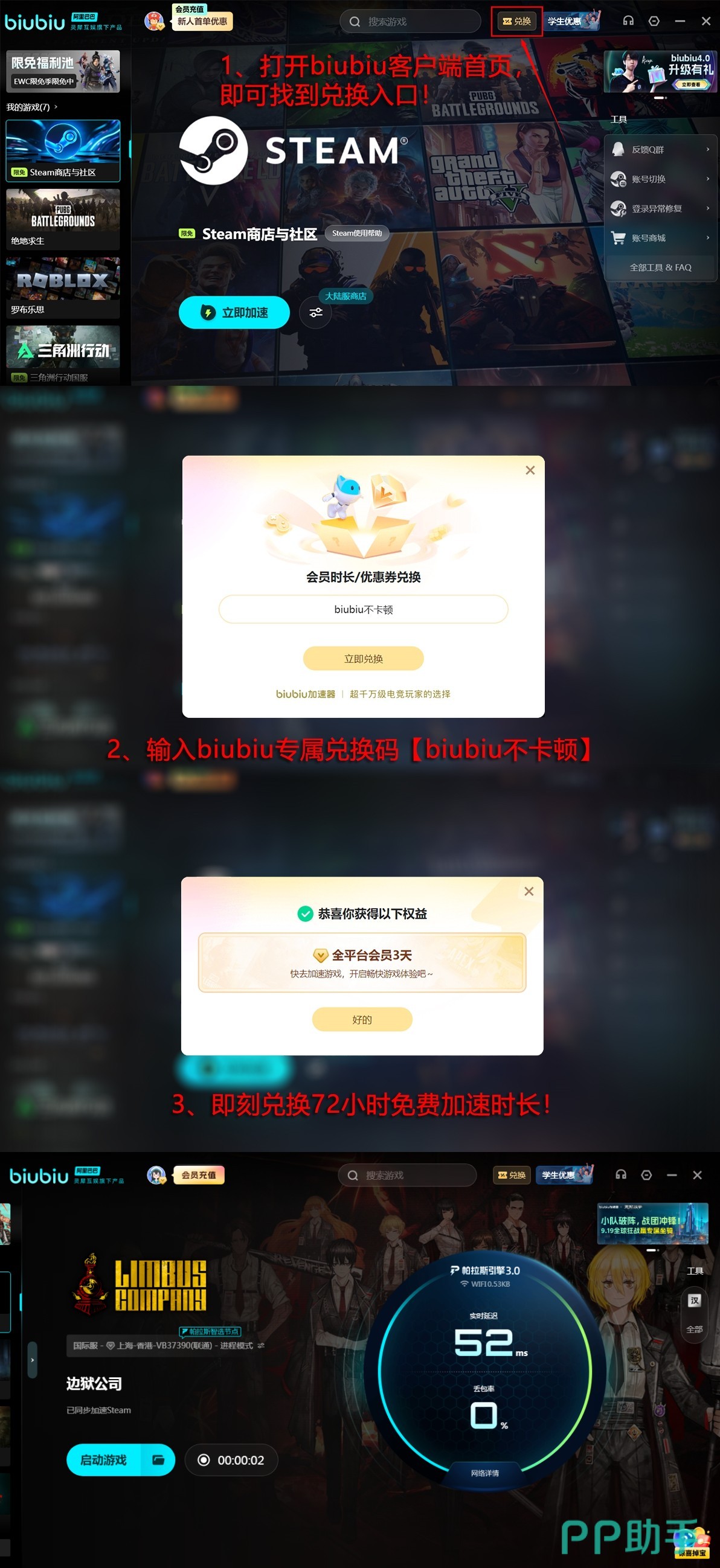 重要福利提示!无论新老用户,输入兑换码【biubiu不卡顿】即可领取3天免费加速时长。首次注册还可额外获得24小时,累计可达96小时免费体验。