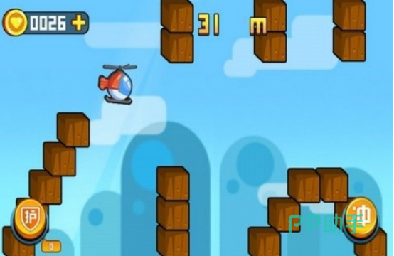 在经典跑酷的玩法上,以直升飞机为主要题材。玩法上来看,利用点触的方式,在屏幕开局之后,右下角会呈现出冲的按钮,而左下角又会呈现出护盾的按钮。手指点击屏幕后就可操控直升飞机逐渐向前,在前进的道路,不论上方或者是下方都会有各种石头作为阻碍,不要让直升飞机和障碍物发生碰撞。
