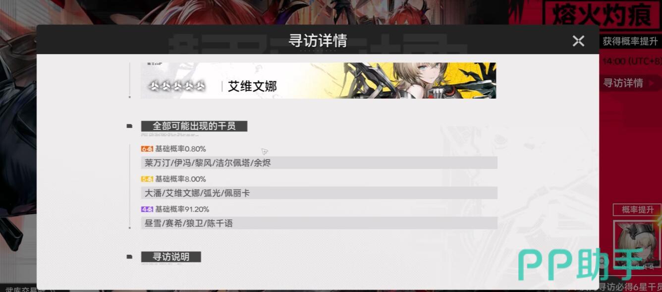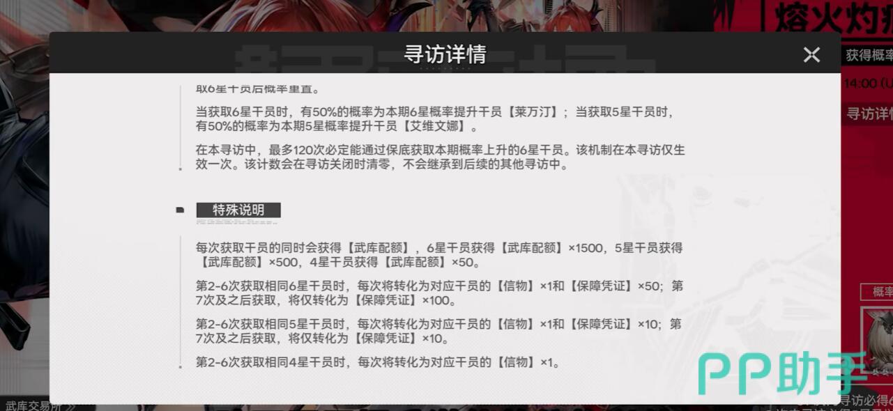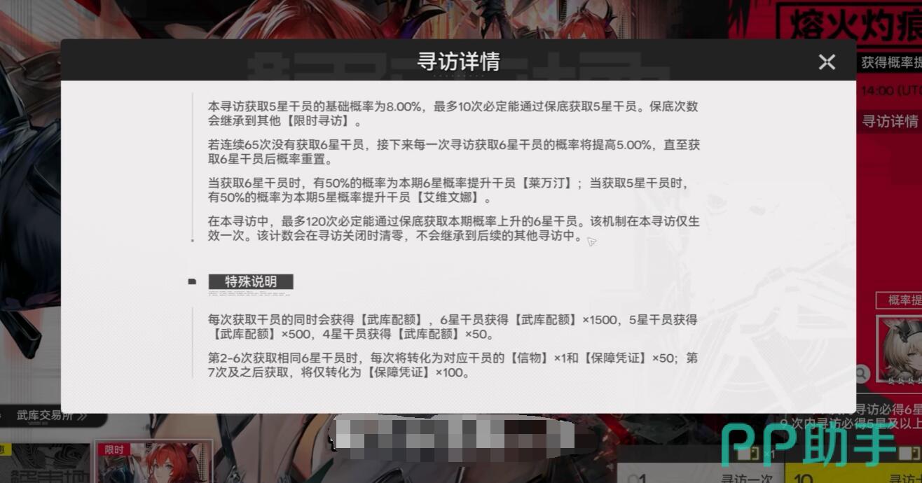 联合寻访池暂定是两周更新一次,UP干员两名,概率各占0.4%,其余六星平分0.4%,如果说大家的目标不在up位抽中概率会被稀释。单人UP池仅一名六星UP,概率0.8%,无大保适合补潜或补图鉴,不建议新手入。限定卡池一般是活动会出持续两周,大保底独立计数,错过返场时间未定,资源可以优先限定卡池,至于更新时间就不确定了。武器池与角色池配额互通,每获得一名六星角色赠一千五百配额,凑齐二千九百八十可十连武器,无需额外投入。