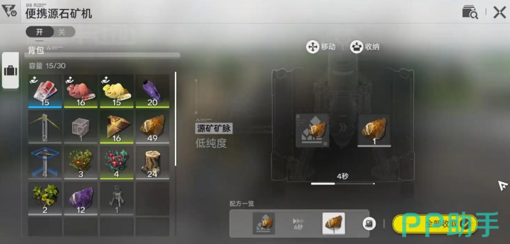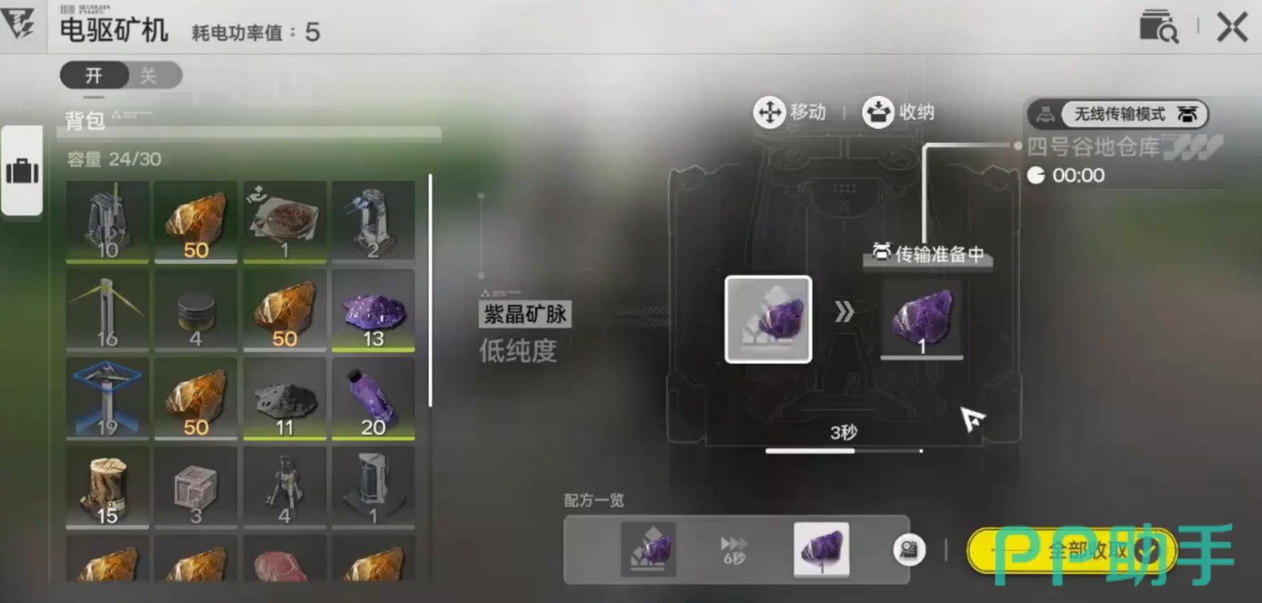 其实解锁矿机不是一个简单任务,首先是要去完成游戏第一章的主线剧情,完成其中的探索山脉地区的所有任务点。完成这些任务后,才能解锁四号谷地地图,而矿机就是要在四号谷地开放的,我们做到这里矿机就算是解锁了。矿机的基础是手动采集,容量上限30单位,超过后自动停止。升级电驱模块后,矿机将获得自动传输功能并提升40%采集速度,但需要稳定电网覆盖,每台电驱矿机需消耗5单位电力,后面可以搭配地热发电机进行供电。