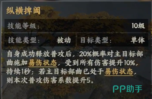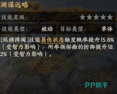 纵横捭阖属于它的被动技能,单体对抗时可以作为优先的技能进行使用。当自身释放出普攻后,拥有20%的概率可以直接对目标部曲释迦易伤状态,如果敌方已经处于易伤的状态,本次释放普攻后将会把伤害的系数提升至5,从而增加更多的额外伤害。定谋贵决也是他被动技能的核心部分,技能等级达到10级时释放普攻后,能够拥有50%的概率提升部曲防御能力,并且以三秒钟作为持续时间,等级越高时,普攻的伤害就会随之增强。