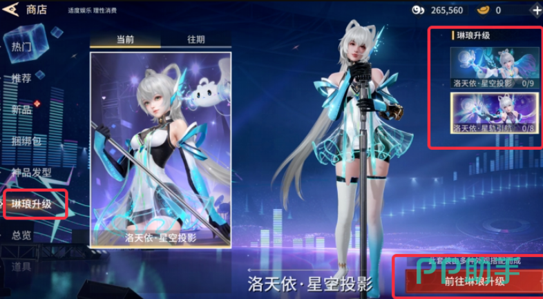 获取该时装后,可解锁“琳琅升级”系统,通过消耗琉璃晶有机会随机获得额外联动外观奖励。同时,在商店的“琳琅升级”界面中,还可逐步兑换洛天依主题的配套装扮,如发型、挂饰及技能特效等。其中,“投影”发型将灰发打造成∞字形环状马尾,搭配发饰与光影延伸的发尾,兼具未来科技气息与东方古典美感。