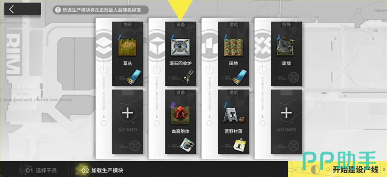 在每次任务开始前,博士可自由配置出战干员及生产模块。生产模块可用于改造地形、布置建筑结构,从而提升资源产出效率。战前准备阶段提供三种任命方式:“机动密令”、“随机任命”与“专项任命”,分别消耗特定道具以指派不同类型的干员执行任务。