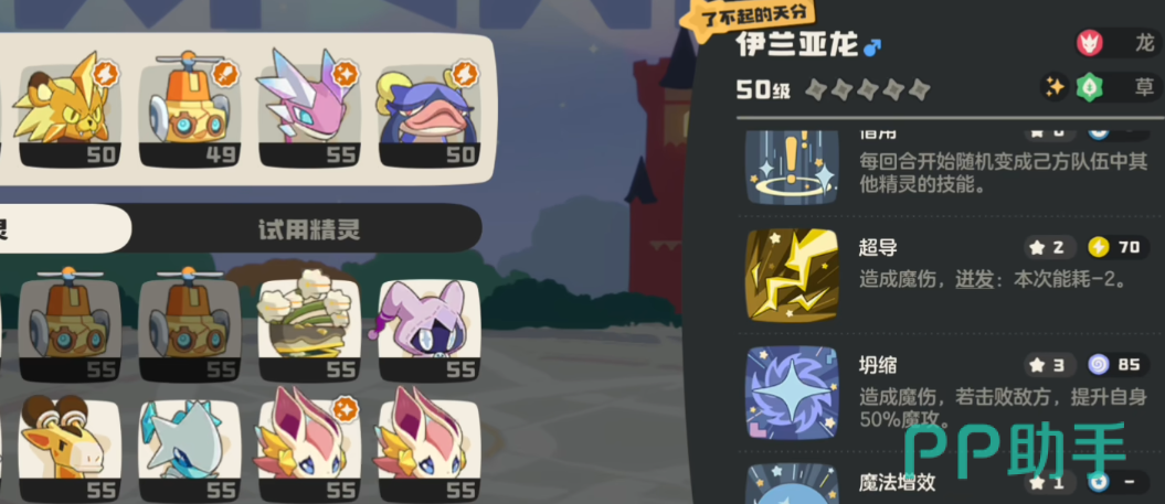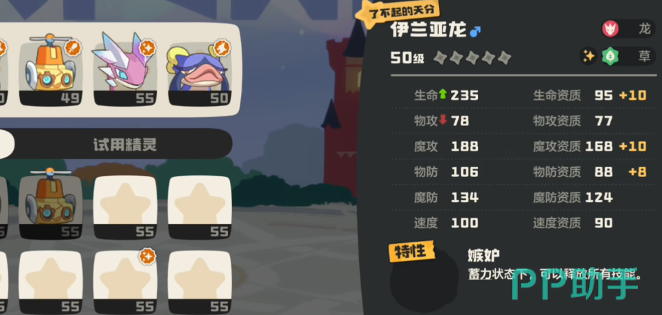 伊兰龙的特性为“嫉妒”,在蓄力状态下可提升30%防御,并能正常使用所有技能。推荐技能组合包括:借用(每回合随机复制队友技能)、超导(魔伤,能耗减2)、坍缩(魔伤,击败后提升50%魔攻)、魔法增效(+80%魔攻)。