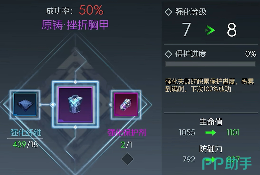 装备还可通过消耗强化纤维进行等级提升,该资源可通过参与副本及其他常规玩法稳定获取。随着强化等级提高,所需材料数量递增,且在高等级阶段存在强化失败导致等级下降的风险。为规避损失,可使用强化保护剂来锁定当前等级,避免掉级;同时,每次使用保护剂还会累积保护进度,当进度条满时,下一次强化必定成功,大幅提升安全性。