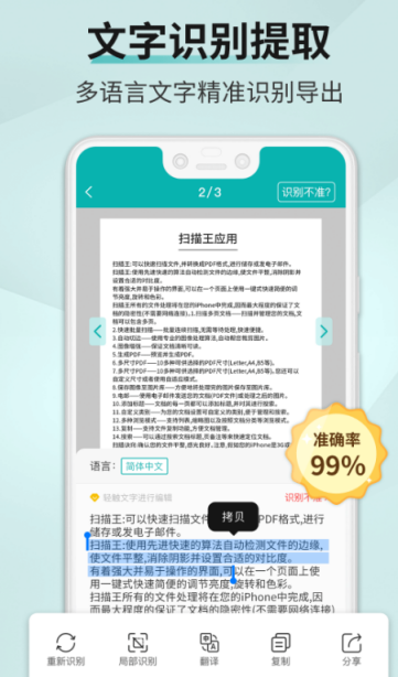 拥有强大的文字提取能力和云端同步功能,在日常生活与工作中均有广泛应用。多年来持续优化用户体验,被誉为“手机上的打印机”。只需拍摄纸质文档,即可快速获取识别结果,支持多语种及局部区域识别,重要图片与视频也可安全存储,防止数据丢失。