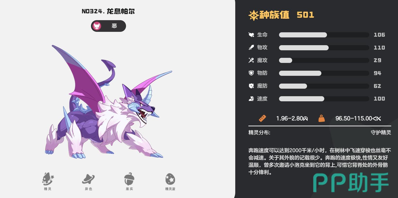 龙息帕尔,全游戏唯一神级宠物,物攻110和速度100让它成为出色的游击手,生命值106也够用。就是魔攻29太低。被动是主动击败时,额外让对方损失1点魔力。技能有强制交换生命比例,吸血,龙炮等等,非常强势。