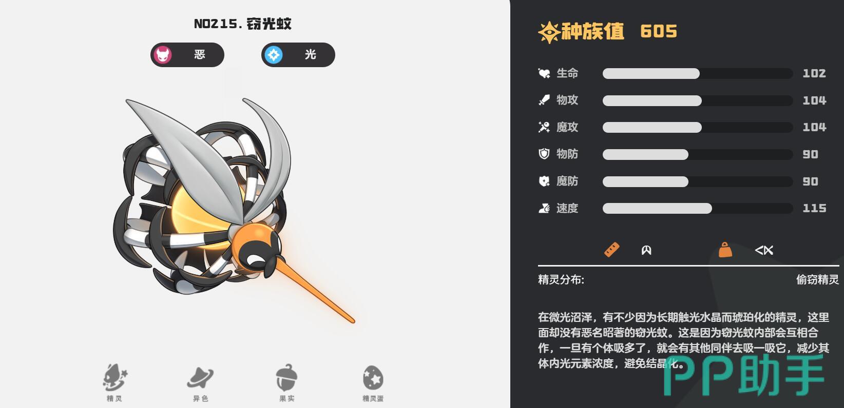 窃光蚊是恶系加光系的双属性精灵,双攻都是104,速度115,能力很均衡。前期就能抓,设定很有反差感,它的物防魔防都是90,生存能力不错,而且它拥有非常不错的吸血combo技能组合,再加上被动(每带一种系别的精灵就能增加10%的技能威力,配合贪婪,获得10%的吸血,能显著增加吸血能力),生存能力极强,是我们刷图资格自足的好精灵,新手强烈推荐。
