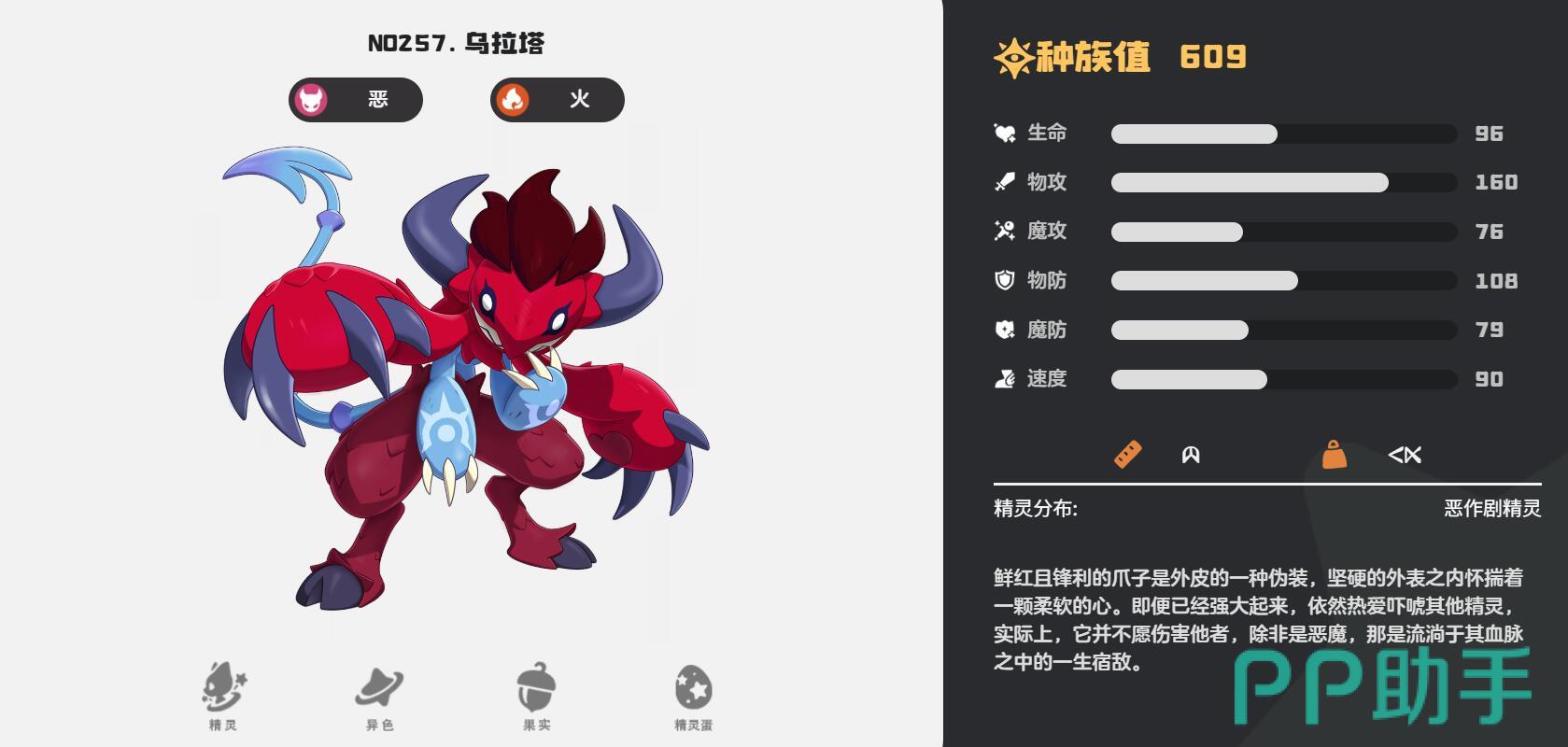 乌拉塔是个混伤恶+火双属性的输出精灵,物攻160高得吓人,物防108也很能扛。战斗时用它当主力物攻手,配上增加物攻的技能,秒掉对方不成问题。魔攻76也不浪费,火系技能能够形成纯输出技能搭配,被动是主动攻击就能获得50%的攻击,有C位潜力,主要技能炎息,火系技能造成物理伤害,为它量身打造,加成全部吃到,输出非常可观。