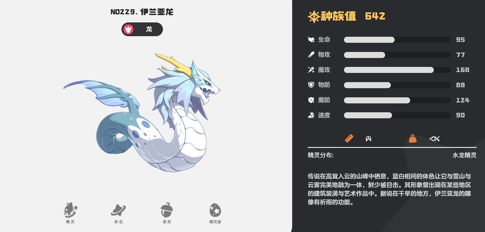 第一个伊兰亚龙,主打魔攻,种族值总和642,魔攻168,游戏中的独一档存在,特性嫉妒让蓄力状态下能释放所有技能。分布在水龙精灵区域的高海拔山峰,进化需LV40。技能可以选择水龙弹+冰咆哮,魔攻堆起来后打BOSS伤害爆表,就是速度偏慢,可以带提速刻印和性格弥补一下。