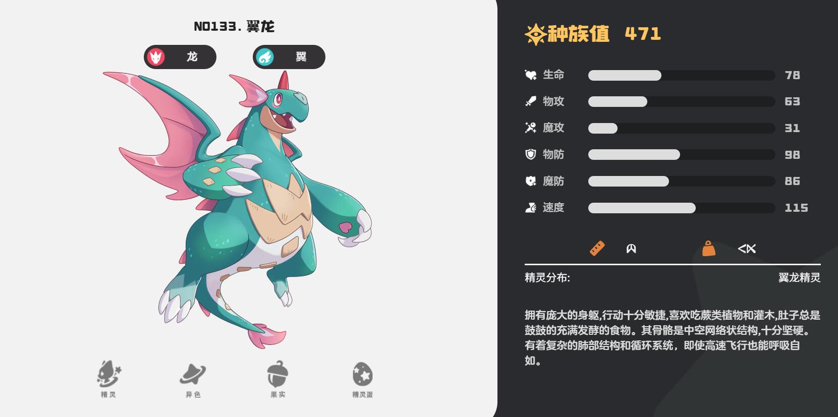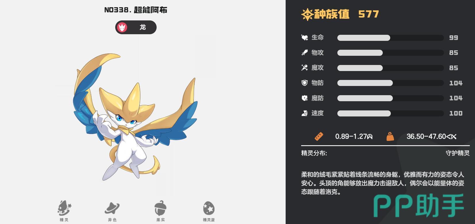 第四个翼龙,前期过渡要说强度的话,翼龙绝对算是一个。别看它种族值471不算顶尖,速度115在低等级段还是非常不错的,特性暴食加速龙系技能获取。进化需LV40,虽然种族值不算最高的那一类,但前期过渡很实用。25级就能学龙翼切割,中期刷图效率比其他精灵快40%,就是后期打PVP有点乏力,建议40级后换下来当仓库管理员。