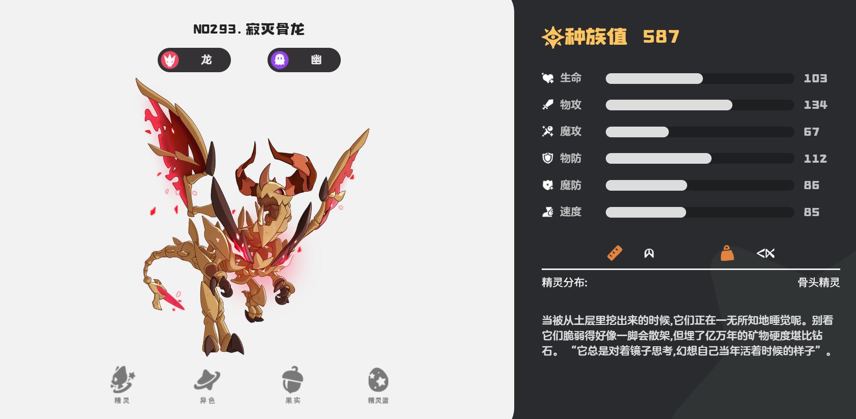 第三个寂灭骨龙,算是进出场玩法的坦克精灵,物攻134+物防112的肉盾配置,特性不朽6回合后自动复活。种族值587,有很高的培养潜力,打消耗战时能活活磨死对手,推荐技能骨头突刺+幽影爪。复活时血量为三分之一最大生命值,可以提前留技能格子放骨甲硬化,复活后还能再顶几回合。