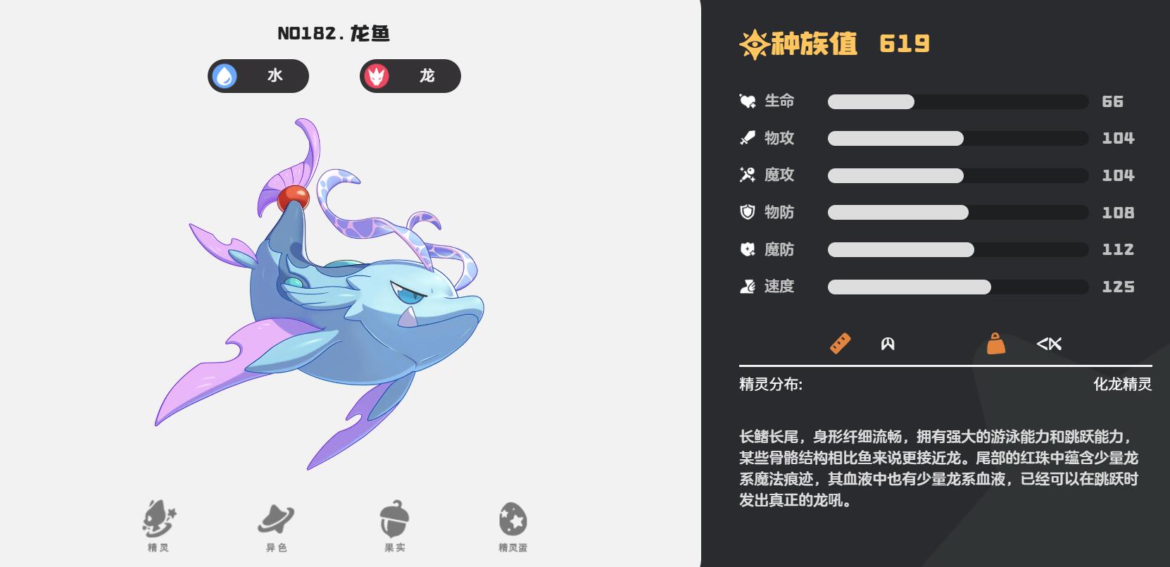第二个龙鱼,速度125全游戏顶尖,种族值也高达619,属性为水+龙双属性克制面很广,进化分LV20和LV32两个阶段。特性洄游能让蓄力时技能能耗减2,龙威+水炮连招几乎无限放。捕捉时要在深海区钓鱼,具体位置为化龙精灵区域,大家可以去碰碰运气。能耗减免对大招龙怒涛效果最明显,原本需要5点聚能,减免后只需3点,实战中能多放一次关键技能。