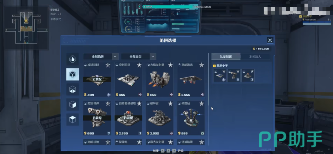 塔防和猎场最大的区别就是塔防是区分辅助和输出的,一把4个人,正常情况下都是2个输出搭配上2个辅助相互配合,一个人只能带个陷阱,那在陷阱选择上大家就要注意看了,打辅助的话陷阱携带减速、防空、自修和修理站,输出的话,陷阱携带自修、大炮和聚能炮,这三个陷阱完全足够输出来使用。