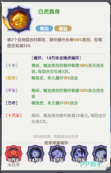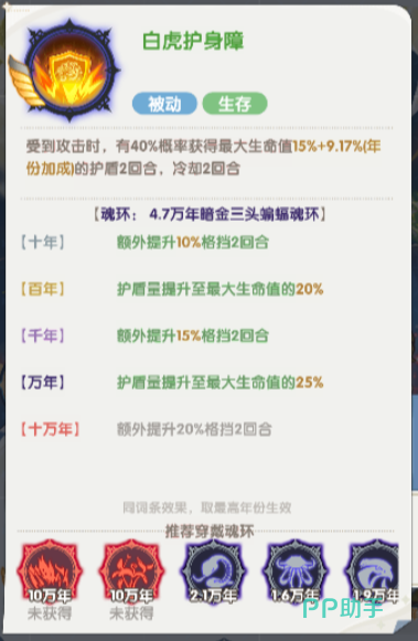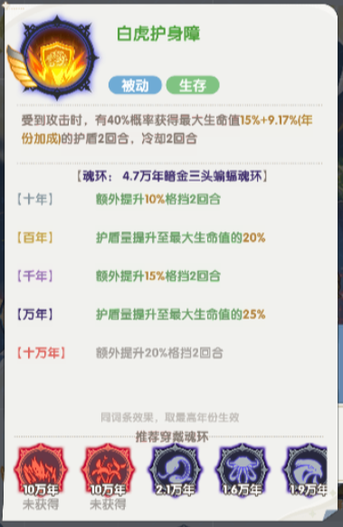 这个技能最高的时候,是在提升到10万年的时候,在10万年之后,对生命值高于50%的敌人,还可以额外造成的伤害数值是达到了130%,另外一个技能叫做白虎护身掌,白虎护身掌的这个技能是在受到敌方攻击的时候,有一定的概率可以获得护盾,当然这里的概率触发是40%的,只要护盾可以触发的话,就会根据自己的生命值15%的数值来进行护盾防御,这个护盾生效的时间是两个回合,但是在使用完毕之后,冷却时间也需要两个回合,再提升到10年之后还会额外提升10%的格挡,毕竟也是两个回合之内会生效的,最高的效果是达到十万年的时候,只要是在十万年里面,大家使用这个白虎护身杖的话,额外提升的格挡数值达到了20%。