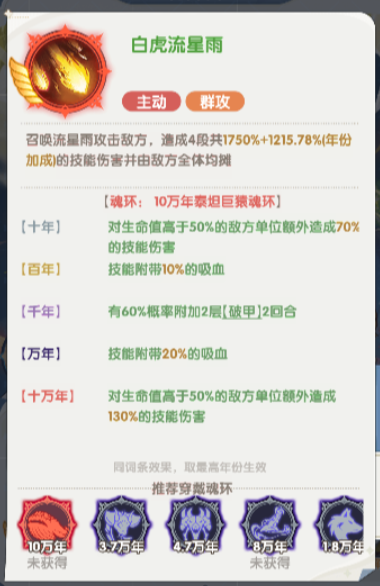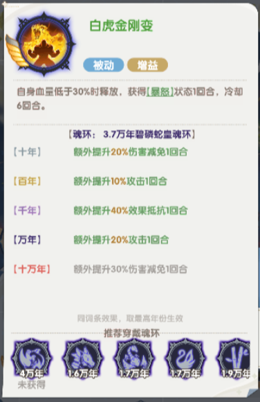 他的三技能叫做白虎金刚变,白虎金刚变这个技能是在他自身血量低于30%的时候才可以用的,相当于一个血量越低越可以带来高输出的技能,在上面触发的时候还可以获得的状态叫做暴怒状态,在暴怒状态里面进行输出的话,会有很高的伤害攻击效果,在10年的时候还可以额外提升20%的伤害减免,如果是百年的话额外提供的只是10%的攻击提升,这个技能最高的效果还是在10万年的时候,额外提升的则是达到了30%的伤害减免,这些效果都是可以持续一个回合生效的,但是这个技能虽然伤害力比较高,在上面带来的冷却时间也比较久,这类伤害使用之后冷却时间需要6个回合。