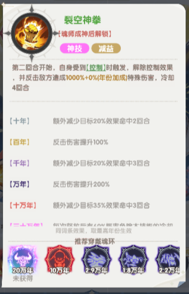 他的神技叫做裂空神拳,这个神技在第一个回合是没有办法触发的,所要触发的话也是在第二个回合开始的时候才能触发,但此时一定是需要在敌方控制他的时候才能进行触发,因为带来的是有一个解除控制类的效果,相当于净化类型的能力,此时清除这个控制效果之后,他还可以给敌方带来一定的反击,反击造成的伤害是1000%加上年份加成这样的数值,此类伤害带来的伤害还是特殊类型的伤害,冷却时间也是达到了4个回合,这个技能在十年的时候还可以额外减少目标20%的效果,在30万年的时候就是最强的时候,其中每一次释放之后,有60%的概率可以让本次技能冷却时间直接化为0,所以在整体的输出上,技能使用的频率还是比较高的。