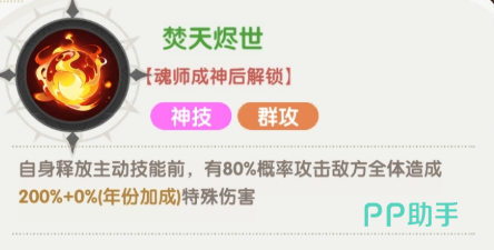 在这个角色达到10级的时候,他还可以解锁的技能叫做九首火凤凰,这个技能也是可以强化马红俊的输出节奏,而且在第三个回合开始的时候,还可以给他提升很多的攻击能力,此时也可以进入持续增长的状态里面,所以他在后期的战斗中火力绝对是很强的一个角色,当然最强的时候还是在他成神的时候,此时他会解锁的一个技能就是神技,在游戏当中叫做焚天烬世,这个神技是作用在主动技能上面的,也是一个群攻的效果,使用的时候有80%的概率可以对敌方全体的敌人造成输出,这里的输出伤害数值是有200%,然后加上年份加成带来的特殊伤害。