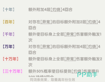 这个神器在10年的时候达到的效果是额外附加4层灼烧,在百年的时候可以对异常目标附加两层灼烧,触发的效果还可以持续4个回合,在技能前摇的时候,可以额外使敌人身上所有的异能伤害额外再次触发一次,在万年的时候如果敌人身上还是有异常目标的话,还可以额外增加四层灼烧的效果,10万年的时候,可以使敌方身上所有的异常伤害额外触发次数达到两次,在最厉害也就是30万年的时候,有50%的概率会使敌人受到主伤伤害提升30%的数值,而且这个效果持续回合也是比较长的。