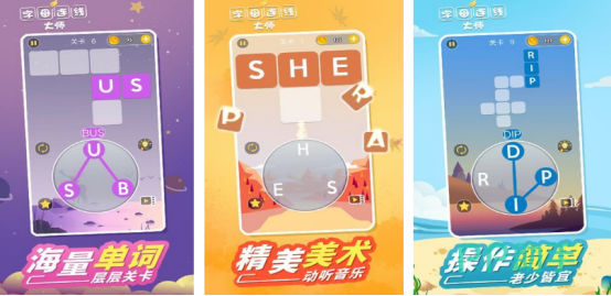 英语的学习对于很多孩子来说,初次接触时,有一定的难度,看似几个简单的字母当拼接在一起时,会形成不同的单词,还代表了与众不同的含义。游戏开始后,其实从画面展现上来看,和成语接龙以及成语猜词的游戏玩,法特别相似,上方看到了几个空白的方块格,而下方却有简单的三个或4个字母,将这些字母随意连接在一起,能组建成不同的词汇。