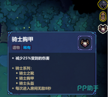 当三件同时装备时,激活套装特效:每次进入新房间后的前8秒内处于无敌状态,非常适合用于应对突发高强度战斗或陷阱密集区域。