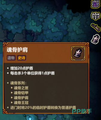 魂骨铠甲在敌人死亡时有一定几率生成环绕自身的防护屏障;魂骨王冠则在完成击杀后赋予使用者临时护盾。集齐整套遗物后,触发专属机制:进入房间时,20%的临时护盾将转化为常规护盾,大幅提升生存能力。