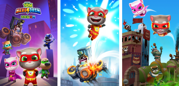 在《汤姆猫英雄跑酷》中,汤姆猫家族全员化身超级英雄,汤姆披上红色斗篷,安吉拉展开星光羽翼,动作设计更具帅气感。游戏中保留了角色专属语音系统,碰到障碍时会发出“哎呀”等俏皮台词,增强沉浸感。操作方式简单直观,通过滑动屏幕即可完成跳跃、下滑和转向,适合新手快速上手。进阶玩家则需精准掌握时机以获取高分。特别设置的亲子协作模式支持双人共控一个角色,一人负责跳跃,另一人控制左右移动,合作闯关还能解锁专属皮肤奖励。