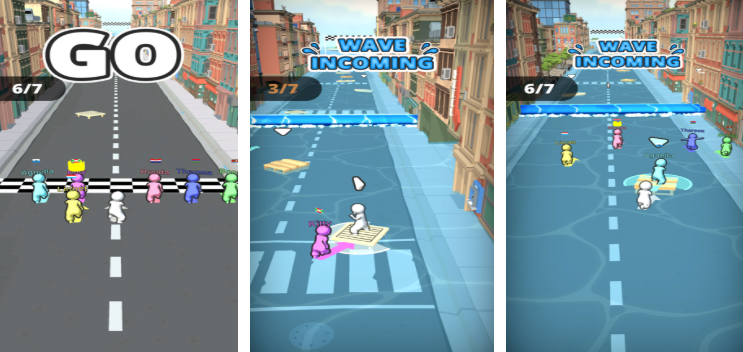 《水上跑酷》创新地将赛道设置在水面之上,玩家需操控角色在浮台、漂浮箱等水上结构间跳跃前行,脚下即是波光粼粼的水域,一旦失足落入水中即判定失败,紧张程度远超陆地跑酷。可选角色各具特色,跳跃高度与移动速度存在差异,部分角色具备短暂踩水滑行能力。道具藏于水上箱子中,包含加速冲刺、防掉落护盾以及吸引金币的磁铁等实用物品。