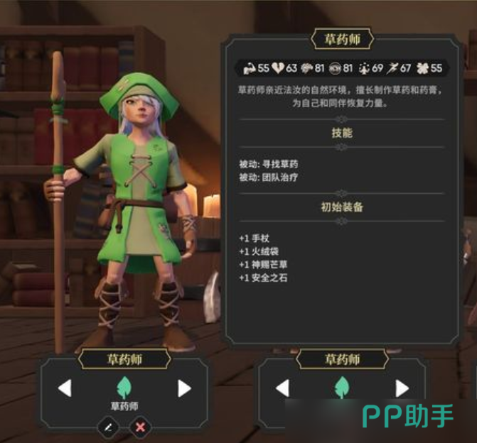 草药师是队伍中不可或缺的支援型角色,其技能为“寻找草药”与“团队治疗”。这两个均为被动技能,且均围绕恢复与辅助展开。“寻找草药”可在每场战斗结束后随机获取一种具有增益效果的草药,用于后续战斗中的状态提升;而“团队治疗”则能在战斗过程中为受伤队友提供生命值回复,保障队伍续航能力。