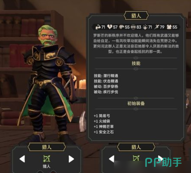 猎人属于高输出远程职业,技能配置更为丰富。其被动技能“百步穿杨”显著提升了攻击射程,使猎人能够在远距离精准打击敌人;“急行步伐”则加快了移动速度,增强战场机动性。主动技能方面,“潜伏精通”允许猎人在隐蔽状态下行动,具体效果由投骰机制决定;“伏击精通”则是对目标发动致命一击的能力,同样依赖掷骰结果来判定成败。