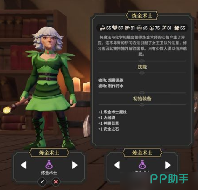 农民是一名基础属性均衡的职业,前期适应性强,可使用的武器种类较多。其技能“建造稻草人”可在回合结束时于前排召唤一个吸引仇恨的假人单位,从而保护后排脆弱角色免受直接攻击。炼金术士则以高智力、敏捷与天赋著称,技能“烟雾逃跑”可在危急时刻释放烟雾干扰敌人,争取逃脱时间;“制作药水”则能合成具备爆炸伤害的投掷类药剂,适用于群体压制或地形杀伤。