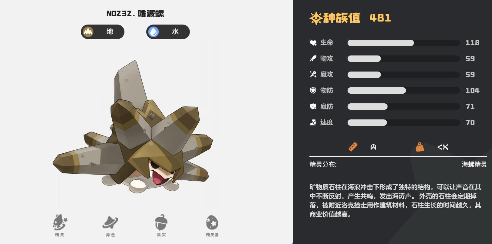 第五位是嗜波螺,具有地+水双属性组合,生命118,物防104,具备合格前排承伤能力。虽然双攻仅为59,但技能机制颇具特色,外壳石柱可释放声波造成控制效果,且能学习潮汐震荡降低敌方速度,再衔接地震技能打出连招压制。该精灵可在海螺沙滩浅水区域捕捉,建议使用中级或高级咕噜球进行捕获。
